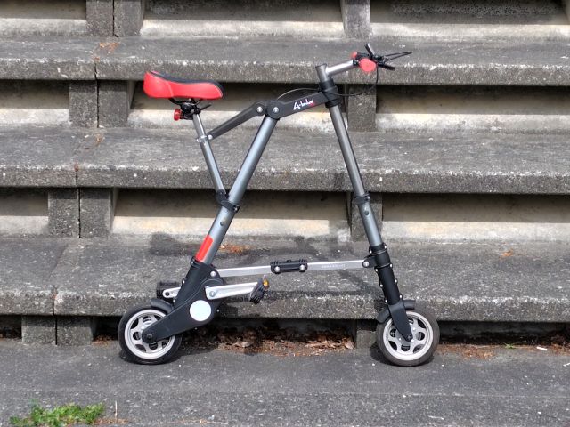 シンクレアリサーチのA-bike Cityです。前後エアタイヤ仕様。展開が早いのでチョイ乗りに重宝してます。輪行旅にも機動力抜群、マジで。